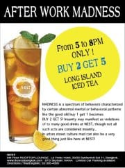 MADNESS is a spectrum of behaviors characterized by certain abnormal mental or behavioral patterns like the good old buy 1 get 1 becomes BUY 2 GET 5! Insanity may manifest as violations of to many good drinks at NEST, though not all such acts are considered insanity.. In urban street culture mad can also be a very good thing just like here at NEST!