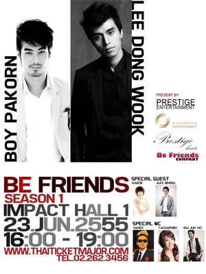 Be Friends Boy Pakorn & Lee Dong Wook Bangkok Thailand 5,000 /2,500 /2,000 /1,500฿ Concert 1479 total views, 0 today Report problem Home Bangkok Events Entertainment Concert Be Friends Boy Pakorn & Lee Dong Wook Bangkok Thailand This ad listing is expired. Photo Gallery Be Friends Boy Pakorn & Lee Dong Wook Bangkok Thailand × Additional InfoStreetPopular RoadBangkok RegionBangkokCountryThailandCityNonthaburiLocation/PlaceImpact Exhibition Hall 1, Muang Thong ThaniZip/Postal Code11120BTS MRTNo StationTelephone02-262-3456DateJune 23, 2012.Time4.00 P.M.PublicTicketsShow Date Saturday June 23, 2012. at 4.00 P.M. Gate Open Approx. 30 minutes before show start. Public Sale From 12 May 2012 onward. Comments block-12 Popular Road Nonthaburi 11120 Get Directions Share Ad BkkEventAdmin Listing Owner Member Since: October 16, 2010