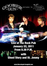 Goober Gun Live in Bangkok Unknow฿ Expired Events 1349 total views, 1 today Report problem Home Expired Events Goober Gun Live in Bangkok This ad listing is expired. Photo Gallery Goober Gun Live in Bangkok × Additional InfoStreetPhayathai RoadCityBangkokCountryThailandZip/Postal Code10400Alternative Rock band, Goober Gun, from England is coming to The Rock Pub again! 3 bands this night: Goober Gun, Ghost Story and St.Jimmy Created by: The Rock Pub – Bangkok`s House Of Rock Comments block-12 Phayathai Road Bangkok 10400 Get Directions Share Ad BkkEventAdmin Listing Owner Member Since: October 16, 2010