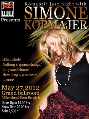 Romantic Jazz Night with Simone Kopmajer Bangkok Thailand 1,500฿ Concert 1163 total views, 0 today Report problem Home Bangkok Events Entertainment Concert Romantic Jazz Night with Simone Kopmajer Bangkok Thailand This ad listing is expired. Photo Gallery Romantic Jazz Night with Simone Kopmajer Bangkok Thailand × Additional InfoStreetCharoennakorn RoadBangkok RegionBangkokCountryThailandCityBangkokLocation/PlaceGrand Ballroom, Millennium Hilton BangkokZip/Postal Code10600BTS MRTSaphan TaksinTelephoneUnknownDateMay 27, 2012.Time8.00 P.M.PublicTicketsShow Date Sunday May 27, 2012. at 8.00 P.M. Gate Open Approx. 30 minutes before show start. Public Sale From 21 April 2012 onward. Comments block-12 Charoennakorn Road Bangkok 10600 Get Directions Share Ad BkkEventAdmin Listing Owner Member Since: October 16, 2010
