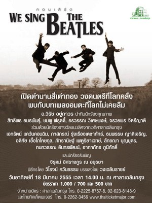 We Sing The Beatles Concert Bangkok Thailand 1,000/700/ 500฿ Amusements 1588 total views, 1 today Report problem Home Bangkok Events Entertainment Amusements We Sing The Beatles Concert Bangkok Thailand This ad listing is expired. Photo Gallery We Sing The Beatles Concert Bangkok Thailand × Additional InfoStreetChalermkrung Road,Bangkok RegionBangkokCountryThailandCityBangkokLocation/PlaceChalermkrung Royal TheatreZip/Postal Code10200BTS MRTNo StationTelephone(662) 225-8757-8DateMarch 18, 2012Time02.00 P.M.PublicTicketsEvent Websitehttp://www.thaiticketmajor.com/concert/concert-detail.php?sid=1161&la=enWe Sing The Beatles Public Sale From 15 February 2012 onward. Gate Open Approx. 30 minutes before show start. Comments block-12 Chalermkrung Road, Bangkok 10200 Get Directions Share Ad BkkEventAdmin Listing Owner Member Since: October 16, 2010